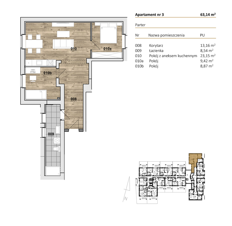 Przedmiotowe mieszkanie nr 3 trzypokojowe o powierzchni całkowitej 63,14mkw składa się z: