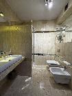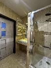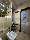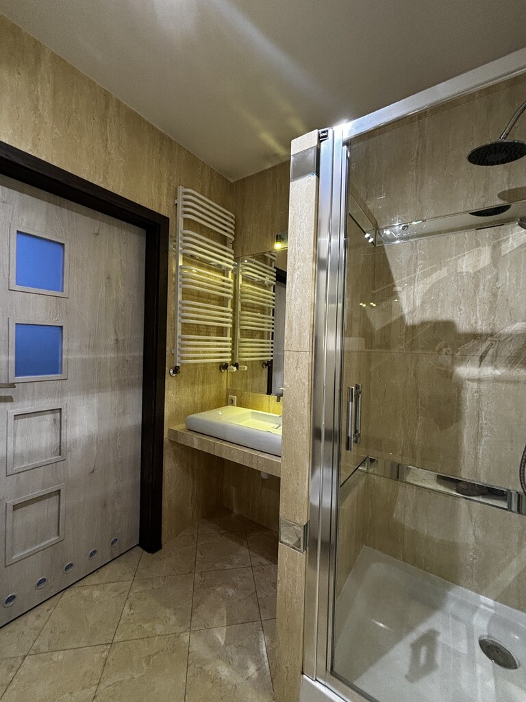 Łazienka z toaletą wykończona gresem. Na wyposażeniu kabina prysznicowa, umywalka.