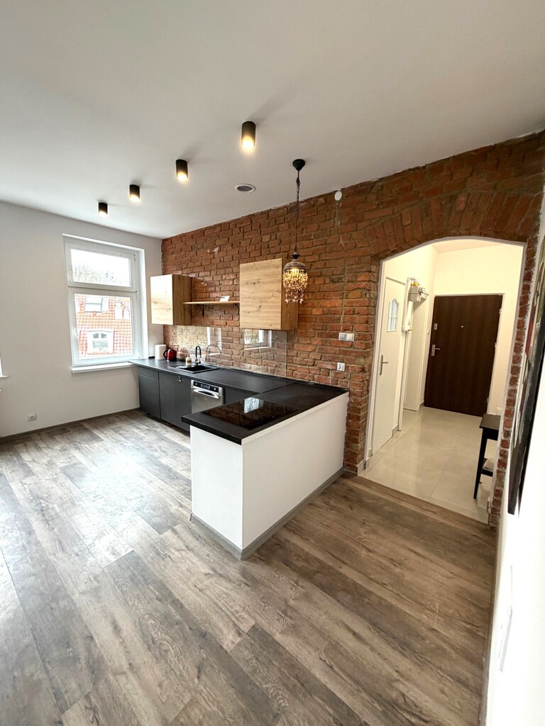 ? kominek w salonie i cegła w kuchni ? wyjątkowy klimat kamienicy