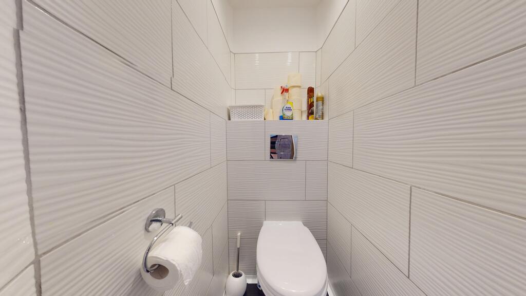 - łazienka w glazurze i terakocie, wyposażona w kabinę prysznicową,