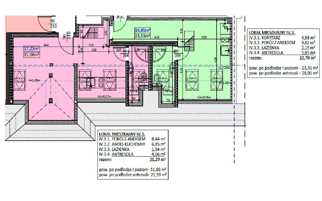 Powierzchnia użytkowa obu lokali to 43,99m2, natomiast powierzchnia całkowita to AŻ 103,81 m2!