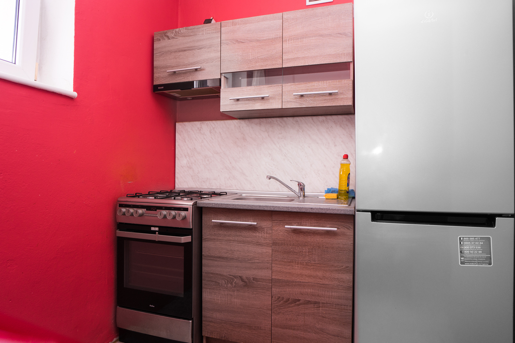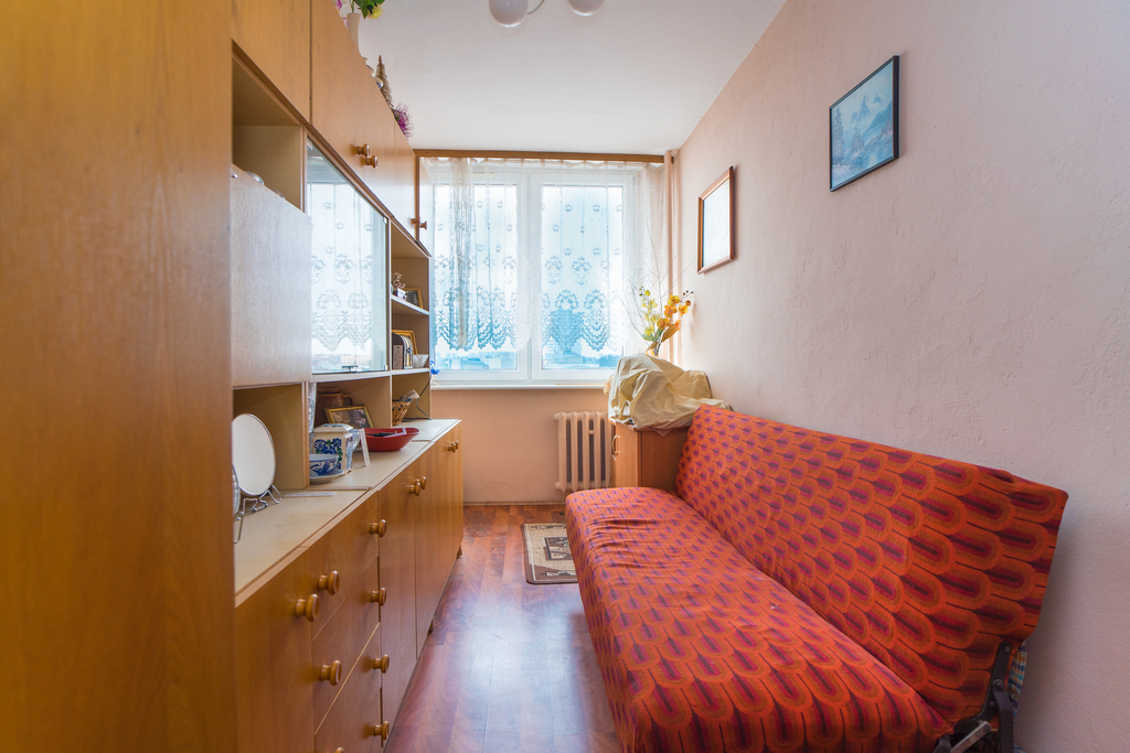 Mieszkanie wymaga odświeżenia albo lekkiego remontu. Na podłogach panele, linoleum, w łazience terakota, oraz glazura na ścianach.