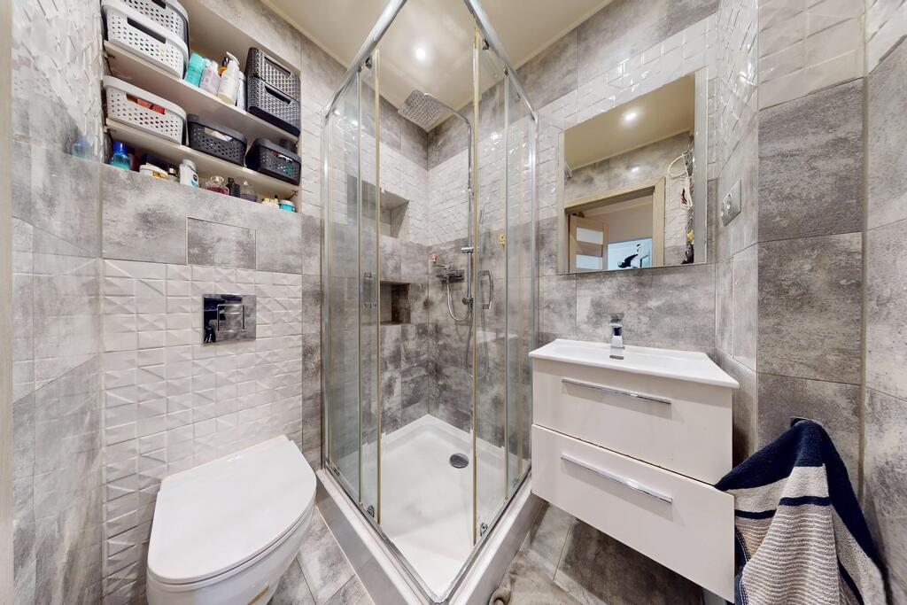 - łazienka razem z WC, w nowoczesnej glazurze i terakocie,
