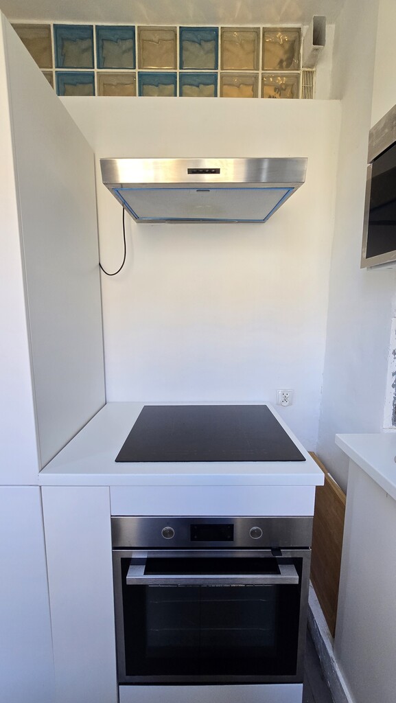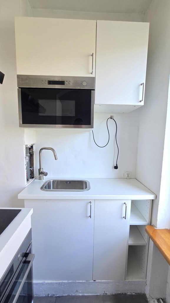 - Kuchnia: widna, w pełni wyposażona w meble oraz sprzęt AGD (płyta elektryczna, piekarnik, lodówka, mikrofalówka).