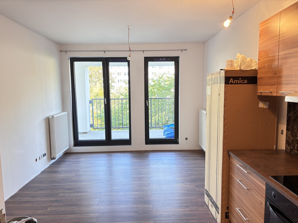 - salonu z aneksem kuchennym wyposażonym w sprzęt AGD. Z salonu wyjście na duży balkon o powierzchni ponad 9m2 z widokiem na zieleń.