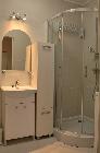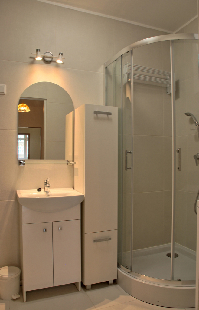 W łazience oprócz wskazanego wyżej podgrzewacza wody znajduje się kabina prysznicowa, umywalka z szafką oraz sedes, jest też miejsce na pralkę.