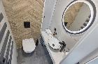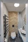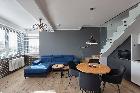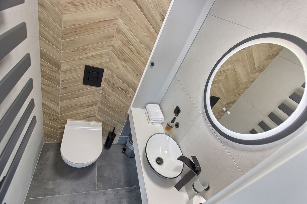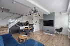 Na 1. poziomie salon z aneksem kuchennym. Kuchnia wyposażona w lodówkę (podblatową), piekarnik, zmywarkę, płytę elektryczną, pralkę w zabudowie. Osobna toaleta.