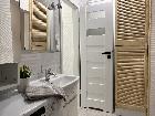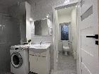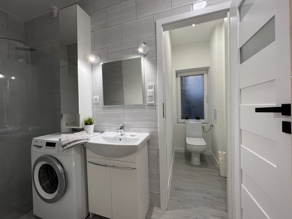 Łazienka z kabiną prysznicową oraz toaletą oddzieloną drzwiami. W łazience znajduje się nowy piec gazowy oraz pralka.