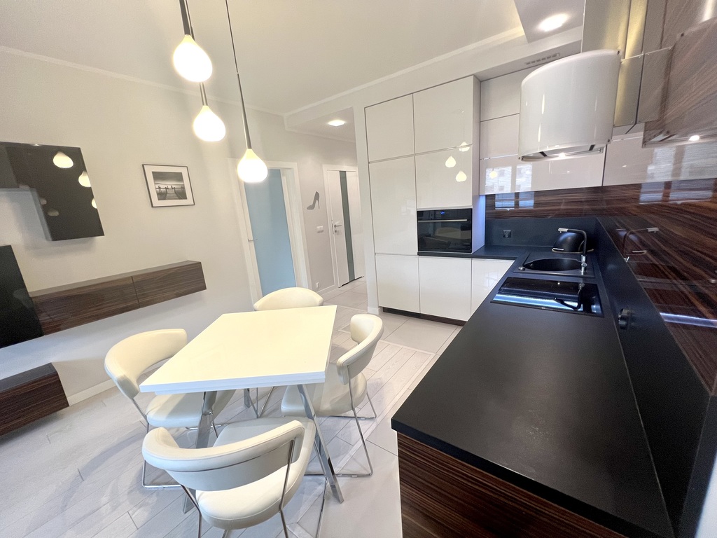 Salon z wyjściem balkon. Kuchnia w formie aneksu, wyposażona w wysokiej jakości sprzęt agd.