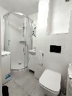 Niewielka łazienka - kabina prysznicowa, umywalka, toaleta i pralka.