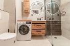 Atrakcyjna łazienka z dużą kabiną prysznicową, pralką.