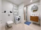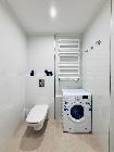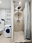 Łazienka wyposażona w prysznic, zlew, muszlę oraz pralkę automatyczną.