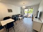 W pokoju dziennym z aneksem do dyspozycji stół obiadowy z krzesłami, duża kanapa rozkładana dwuosobowa, stolik kawowy oraz lustro.