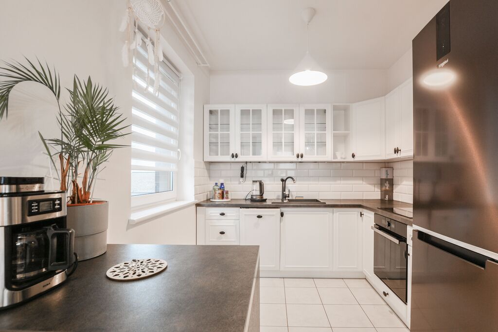 - Nowoczesna kuchnia wyposażona w funkcjonalne meble i niezbędny sprzęt AGD.