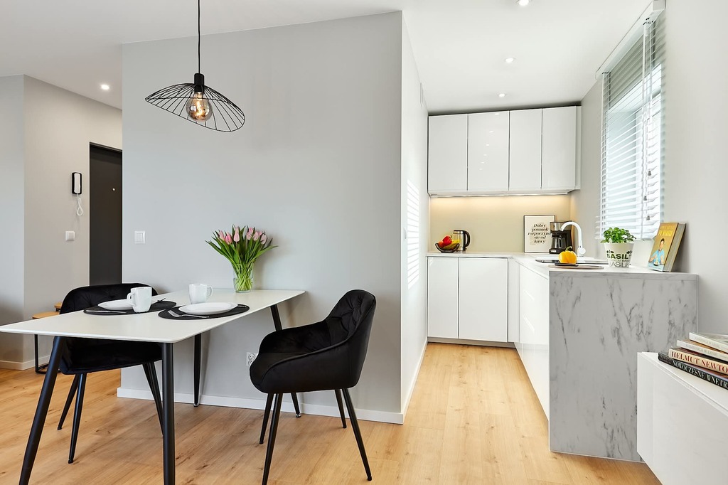 - kuchnia z płytą grzewczą, lodówką i zmywarką