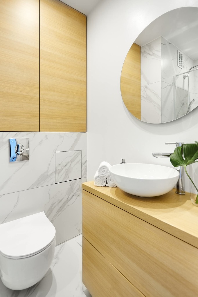 - łazienka z prysznicem i pojemną zabudową meblową