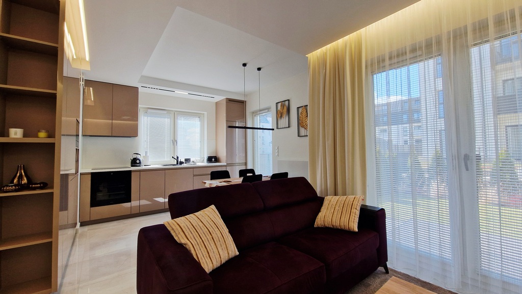 - salon z w pełni wyposażonym aneksem i szafami w zabudowie