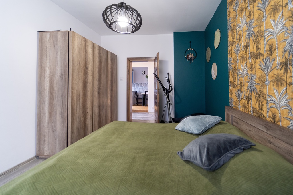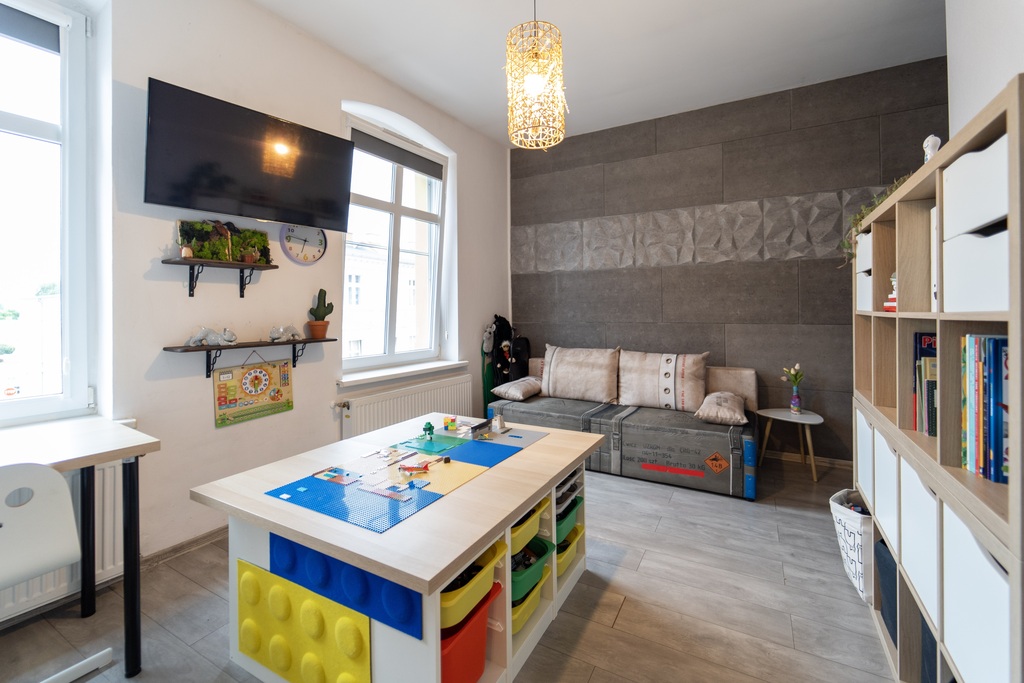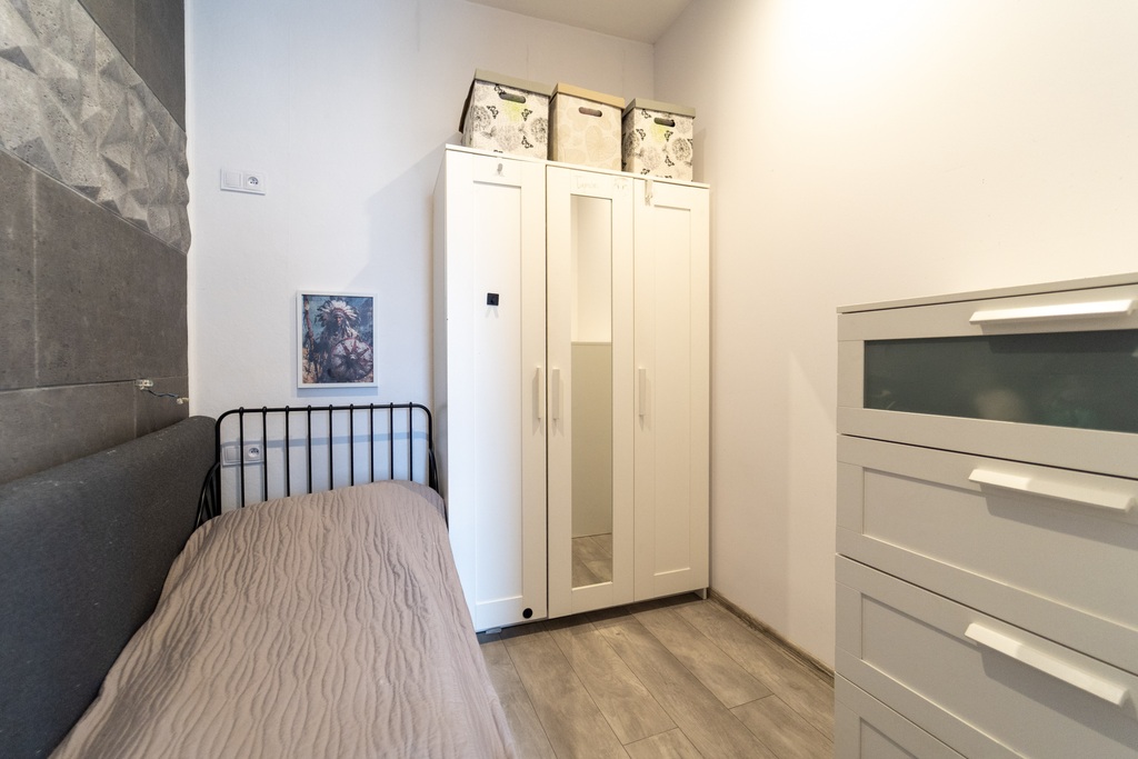 - dwóch oddzielnych sypialni, w tym jednej z wydzieloną strefą dzienną i nocną (idealna jako pokój dziecięcy ),