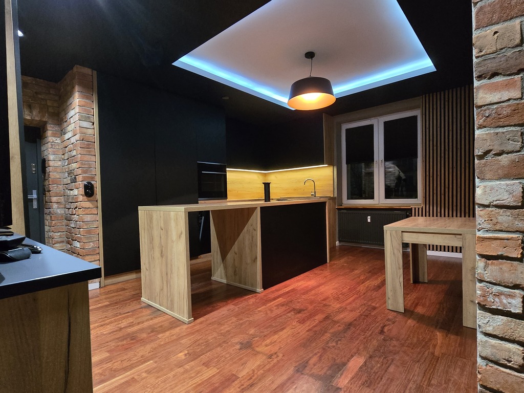 - Nowoczesna kuchnia z meblami na wymiar, wyspą kuchenną oraz pełnym wyposażeniem (płyta indukcyjna na siłę TESLA, piekarnik, zmywarka, lodówka)