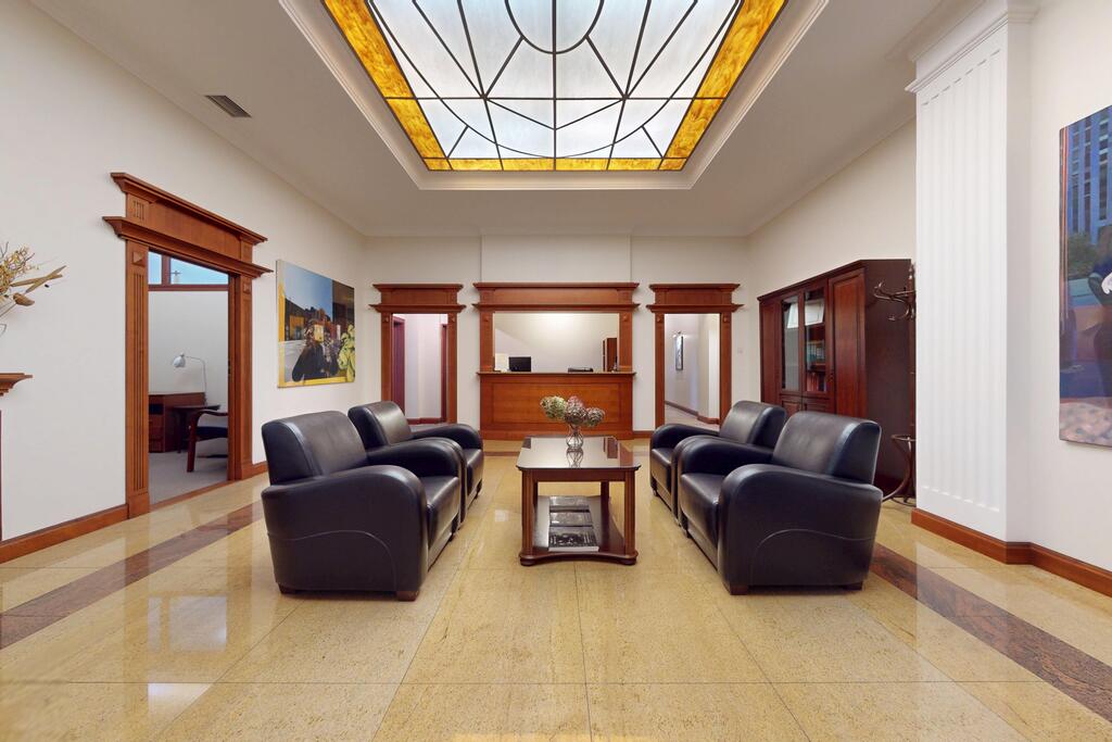 Pierwsza część o powierzchni 240 m? jest kompletnie wykończona w bardzo wysokim standardzie, z wnętrzami utrzymanymi w stylowym, eleganckim charakterze. W jej skład wchodzi przestronny i reprezentacyjny hol, który stanowi doskonałe pierwsze wrażenie dla klientów oraz wizytówkę lokalu. Dalej znajduje się pięć okazałych, reprezentacyjnych gabinetów, zaprojektowanych z dbałością o detale i komfort pracy. Wydzielono również część socjalną, obejmującą toaletę oraz w pełni wyposażoną kuchnię, co zapewnia wygodę codziennego użytkowania. Ta część lokalu jest gotowa do natychmiastowego wprowadzenia i doskonale nadaje się na kancelarię notarialną, adwokacką, biuro doradcze, gabinety lekarskie lub prestiżową siedzibę firmy.