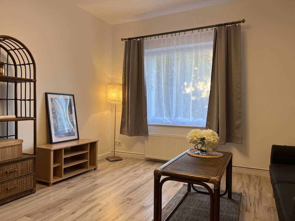 Trzy przestronne, jasne pokoje - sypialnia z dużym łóżkiem i szafą, pokój dzienny z sofą oraz pokój obecnie pełniący funkcję domowego biura.