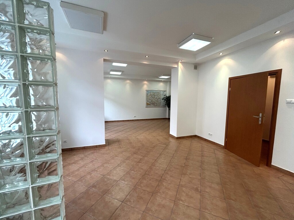 - pomieszczenie biurowe od frontu (pow. 43,90 m2) z wydzielonymi dwoma strefami (pierwsza z wejściem z ulicy, druga z balkonem), na podłodze terakota, okna PCV, rolety zewnętrzne, przegroda ze szklanej cegły przy wejściu