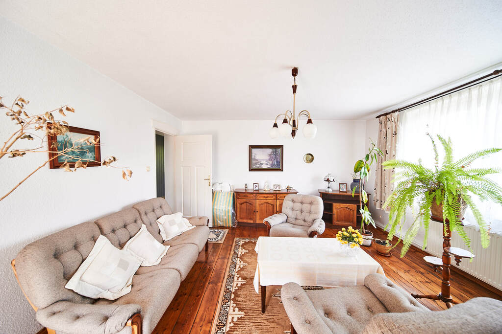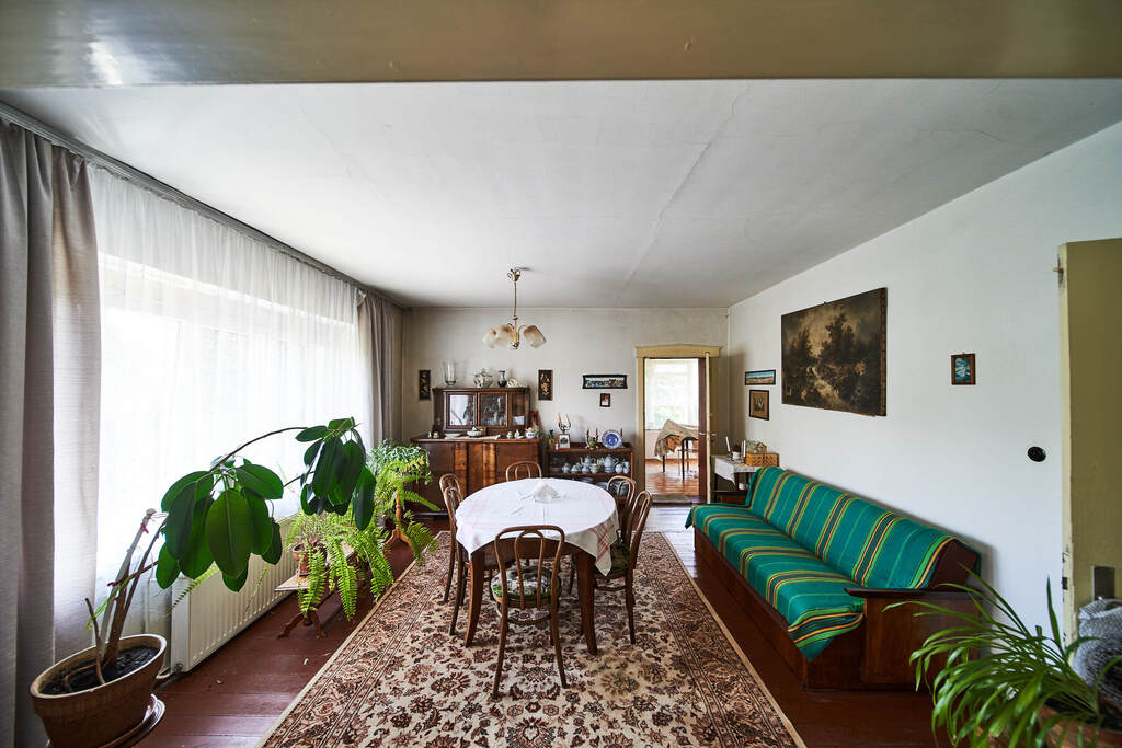 Parter domu stanowi salon ze starymi, przesuwnymi drzwiami, 3 pokoje, kuchnia ze spiżarką, łazienka z oknem i przedpokój.
