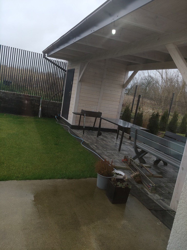 Przed domem właściciel wybudował wiate garażową wraz z pomieszczeniem na przechowywanie.