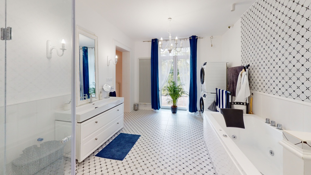 - Parter (126 m?): Przestronna strefa dzienna (44 m?) z kuchnią, jadalnią i salonem z imponującym kominkiem (34 W) oraz wyjściem na duży, zadaszony taras wschodni (ok. 30 m?). Dwa duże pokoje (25 m? każdy), z których jeden jest sypialnią z wyjściem na drugi, betonowy taras północny. Dwie eleganckie łazienki, w tym główna (15 m?) z dwuosobową wanną z hydromasażem.