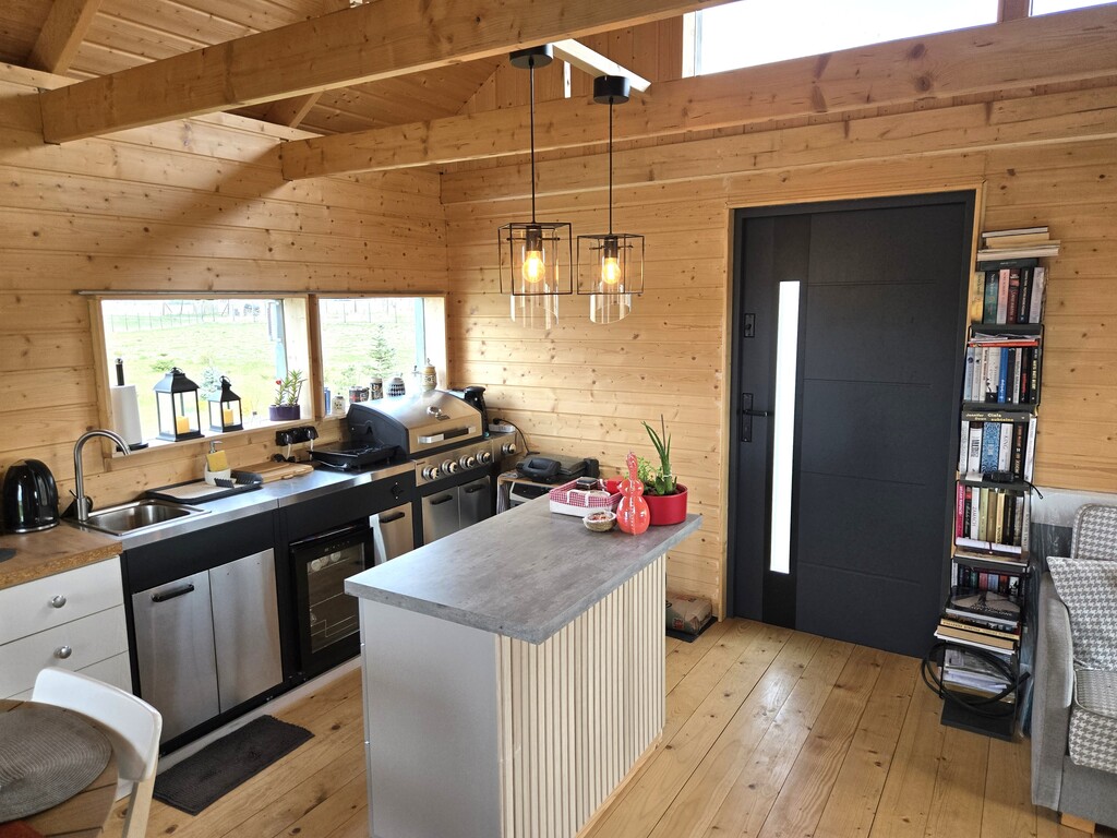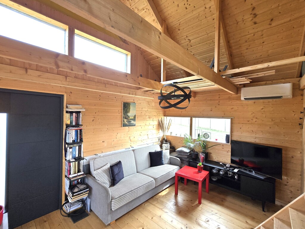 Wnętrze: Wykończone naturalną deską elewacyjną, co nadaje wnętrzu ciepły, skandynawski klimat.