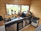 Parter: Otwarta przestrzeń dzienna z aneksem kuchennym (kuchnia ze stali nierdzewnej, lodówka) oraz łazienka z wanną i umywalką.
