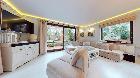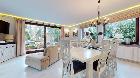 -Salon z kominkiem i aneksem kuchennym z dużymi oknami antywłamaniowymi wychodzącymi na zieleń ogrodu