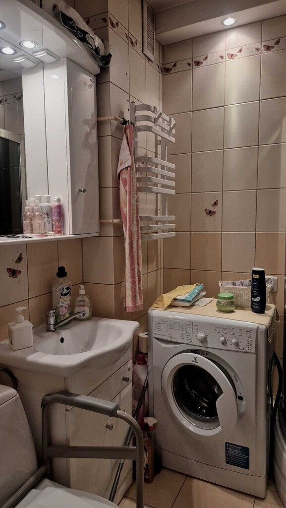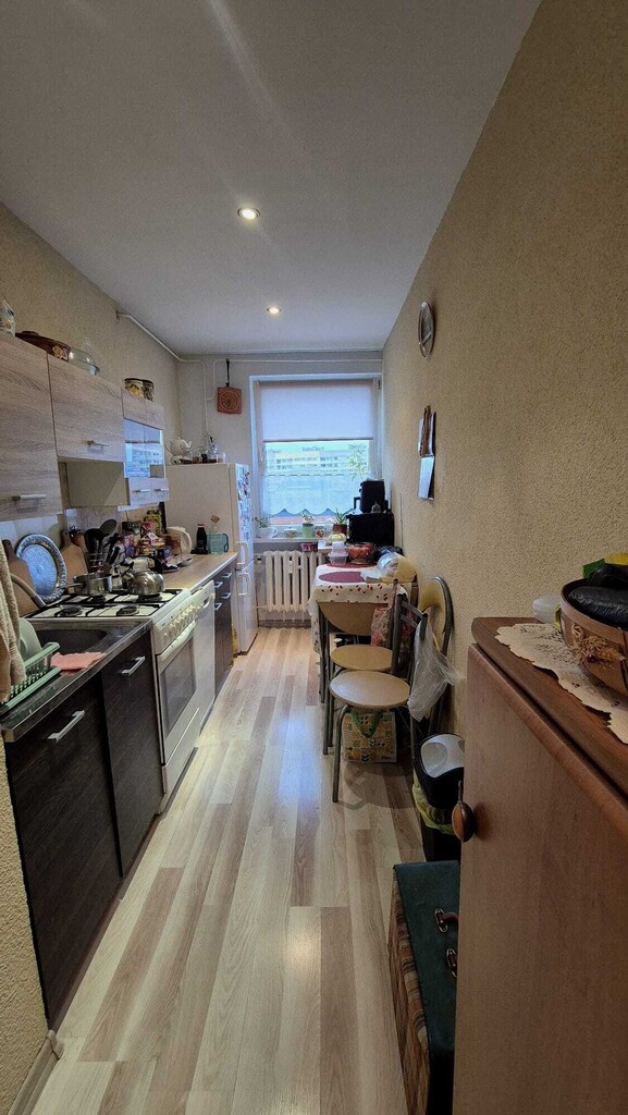 W mieszkaniu na podłogach znajdują się panele, ściany tapetowane, łazienka w glazurze i terakocie.