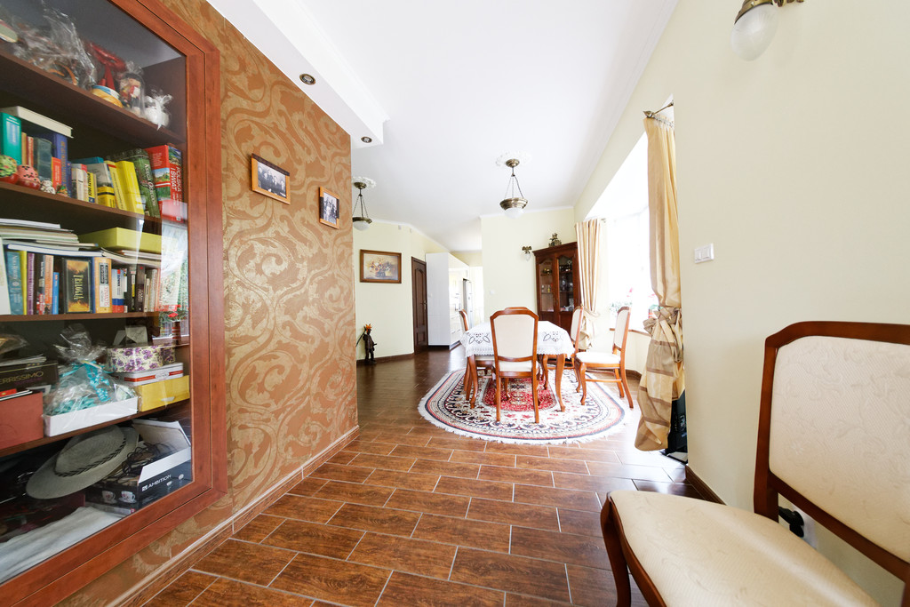 Parter: Mieszkanie dla właściciela. Duży salon z kominkiem połączony z częścią biurową, jadalnią i kuchnią. Przy kuchni zlokalizowano małą spiżarnię. Korytarz, z którego jest wejście do sypialni z wewnętrzną łazienką i garderobą, toalety dla gości, salonu i jadalni oraz wejście do podwójnego garażu.