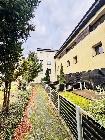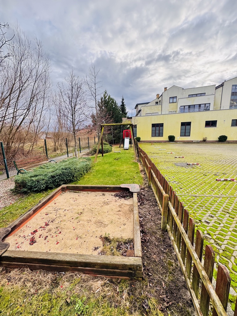 Teren zamknięty, monitorowany z dużą ilością zieleni i małym placem zabaw.