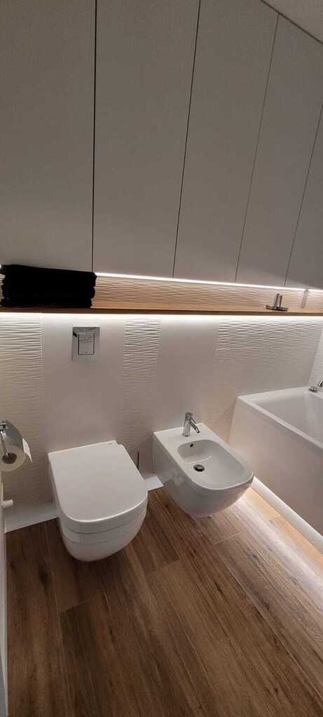 - łazienkę z wanną, prysznicem oraz toaletą i bidetem