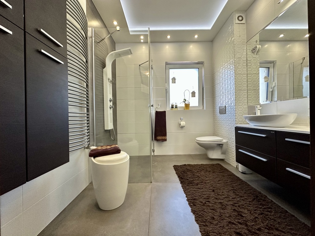- łazienka z kabiną prysznicową.