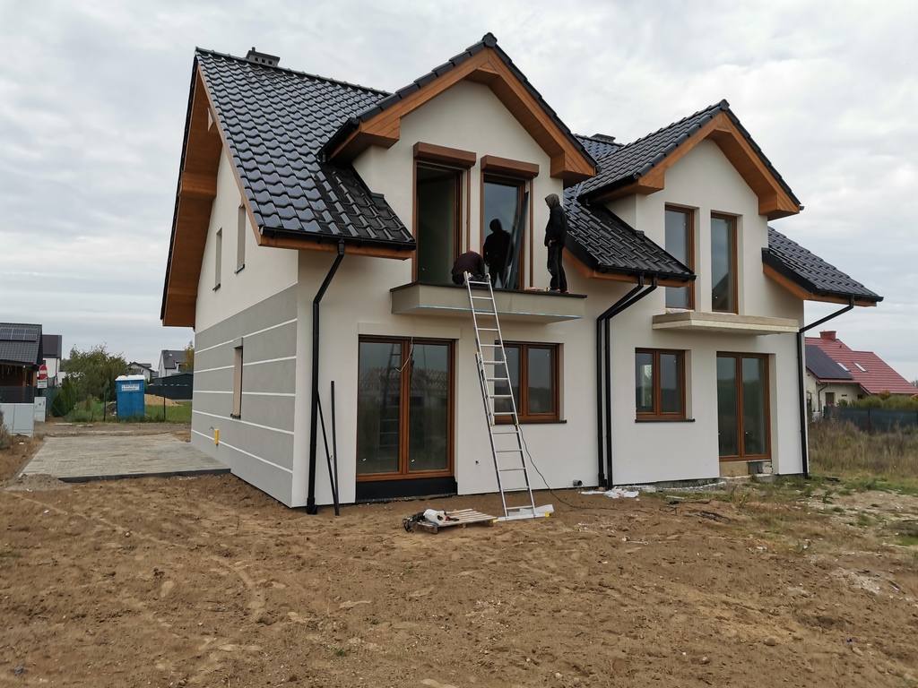 Ściany zewnętrzne - bloczek solbet docieplony styropianem grafitowym i wykończony tynkiem silkatowym , dachówka ceramiczna , okna PCV - pakiet trzyszybowy niskoemisyjny , tynki wewnątrz maszynowe gipsowe , posadzki maszynowe , kominy systemowe (przygotowane do kominka) , schody żelbetowe , poddasze docieplone wełną mineralną , schody strychowe.