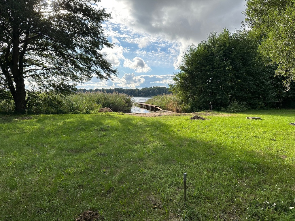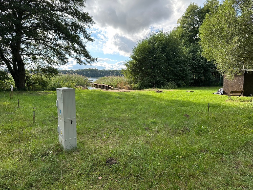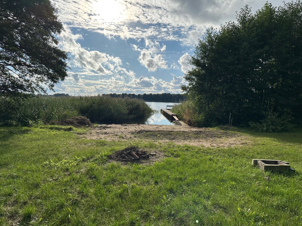 Działka rekreacyjna położona nad jeziorem z własną linią brzegową oraz pomostem.