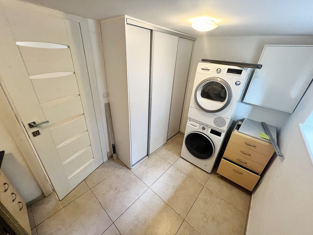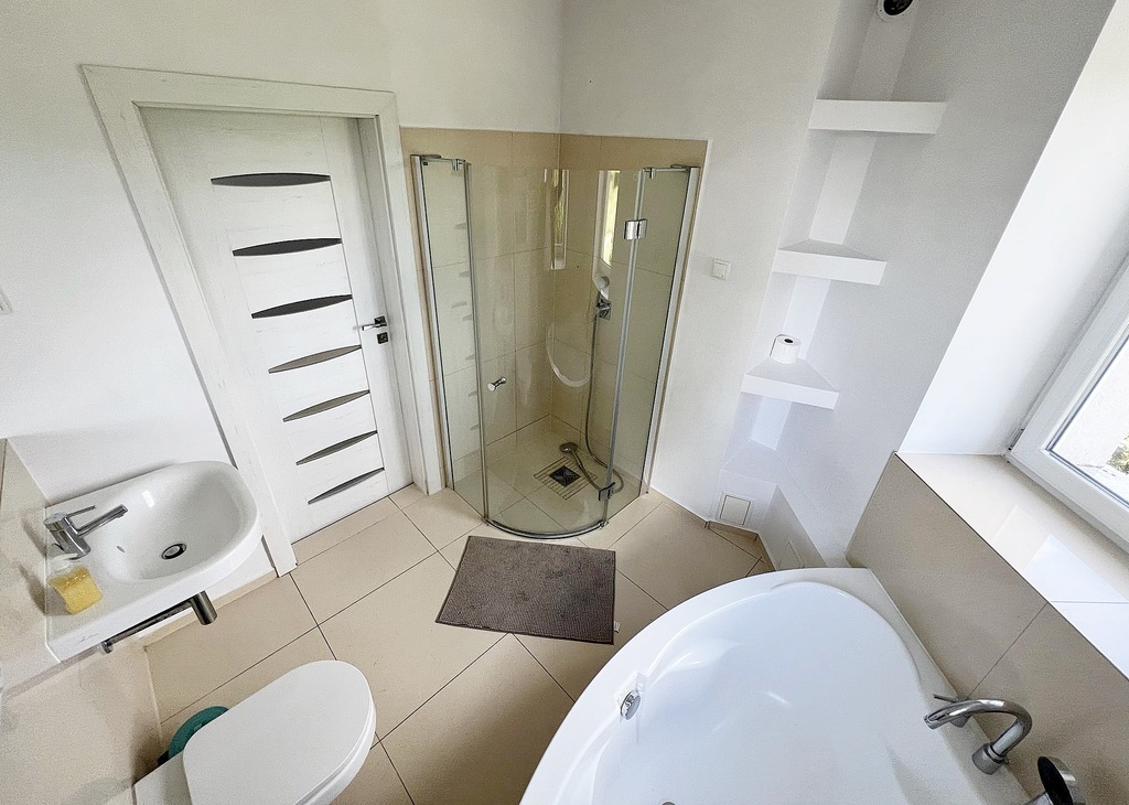 Dom posiada garaż dwustanowiskowy z pomieszczeniem użytkowym nad nim, obecnie wykorzystywanym jako siłownia.
