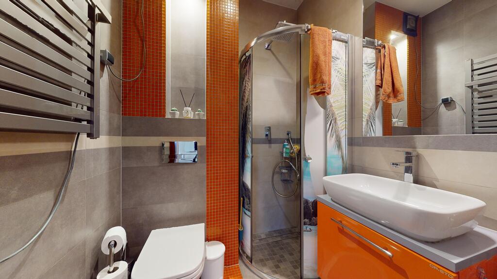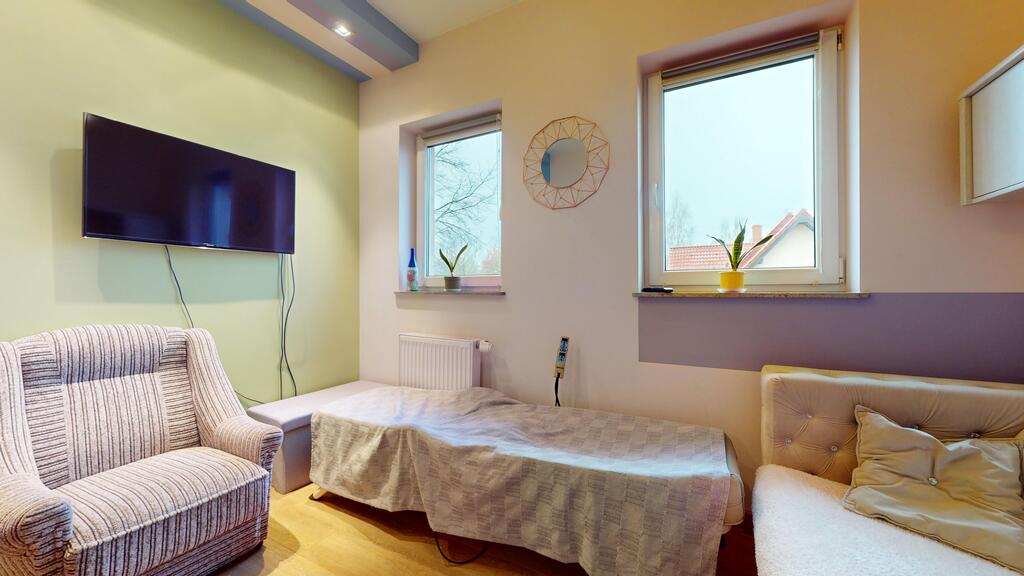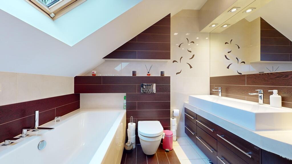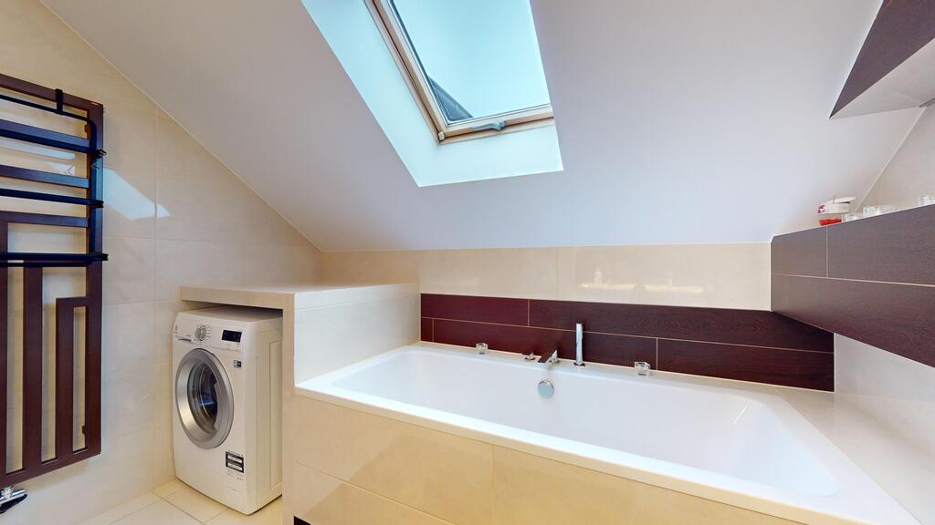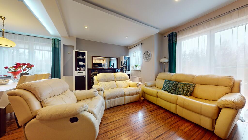 ? Przyziemie: Dół domu składający się z dużego pokoju około 23 m2, garaż 18 m2 i pomieszczenie techniczne około 4 m2, co zapewnia dodatkowe miejsce na przechowywanie oraz biuro. Pokój ten jest wykończony w standardzie mieszkania, jest ogrzewany. Garaż w bryle budynku ogrzewany. Pomieszczenie techniczne z toaletą, pralką, piecem gazowym, zasobnikiem na wodę. Pod wiatą taras. Możliwe przerobienie na osobne mieszkanie.