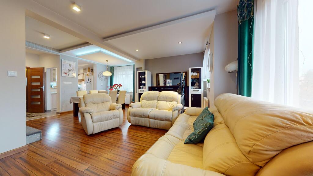 ? Pomieszczenia: 5 pokoi (salon, 3 sypialnie, biuro) w tym 1 w przyziemiu jako biuro, kuchnia, 2 łazienki, garaż, pomieszczenie techniczne z kolejną toaletą.Rozkład: