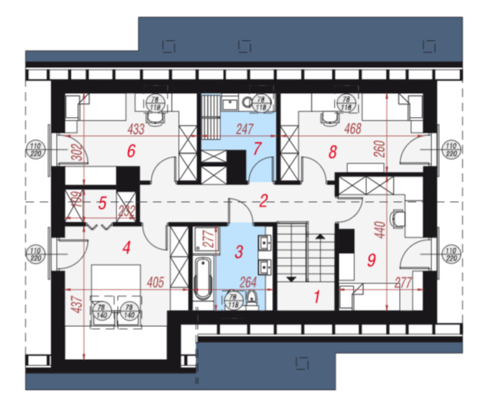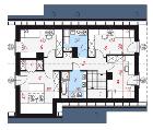 - poddasze (pow. użytkowa 65,74 m2): pokój (10,20 m2), pokój (10,18 m2), pokój (9,99 m2), pokój (9,09 m2) z garderobą (2,34 m2), łazienka z wanną, umywalką, bidetem i toaletą (5,88 m2), pralnia (4,59 m2), hol (8,52 m2), schody (4,95 m2).