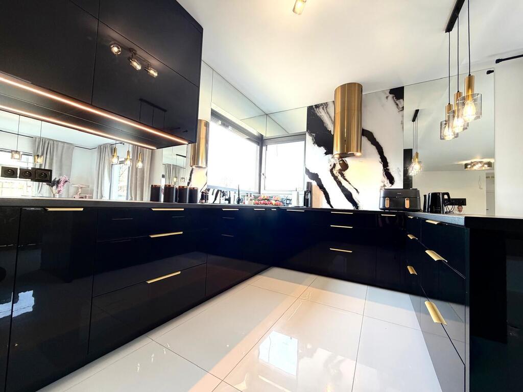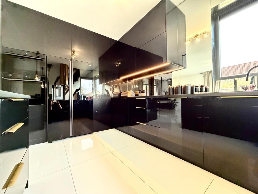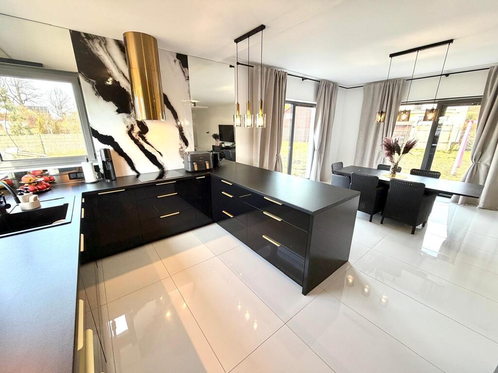Rozbudowana stolarka wewnętrzna w postaci zabudowy kuchennej, zabudowy szaf w sypialni, garderobie i korytarzu.