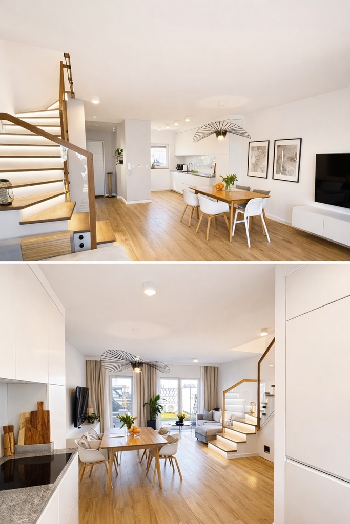 Opis:Na sprzedaż wyjątkowy dom w zabudowie szeregowej w jednej z najbardziej pożądanych dzielnic Szczecina ? Gumieńce. Nieruchomość z 2020 roku, wykończona według projektu architekta wnętrz, gotowa do zamieszkania bez żadnych nakładów finansowych.Powierzchnia i układ:? 78,1 m? salon z kuchnią ,wc, trzy sypialnie ,łazienka + dodatkowa przestrzeń użytkowa 16 m? ? idealna jako kolejna strefa ? biuro, pokój hobby lub dodatkowa sypialnia? Ogródek 41 m? w użytkowaniu z tarasem drewnianym i pergolą? 2 miejsca postojowe zakup obligatoryjny każde po 40tys + 3 miejsca gościnne ogólnodostępne na osiedluStandard wykończenia:? Kuchnia stolarska na wymiar ? blat z granitu Viscount White, fronty lakierowane mat, lodówka 70 cm w zabudowie, piekarnik i zmywarka w zabudowie, płyta indukcyjna zlicowana z blatem, zlew i bateria Grohe? Pralko-suszarka z pompą ciepła w zabudowie pod schodami (może pozostać na wyposażeniu)? Łazienka: meble z forniru dębowego na zamówienie, umywalka Laufen, armatura Hansgrohe/Grohe/Kludi, płytki Tubądzin Torano? Schody z litego dębu z szklanymi balustradami i podświetleniem LED? Zabudowy stolarskie na wymiar w całym domu (przedsionek, pod schodami, sypialnia)? Ogrzewanie podłogowe w całym domuKomfort:? Klimatyzacja dwustrefowa ? kasetonowa obsługująca piętro i salon + osobna jednostka na poddaszu z funkcją grzania i chłodzenia? Poddasze ocieplone pianką PUR ? bardzo dobra izolacja termiczna? Oświetlenie strefowe w salonie, sceny świetlne, włącznik przy łóżku? Osiedle zamknięte z bramą ? bezpieczeństwo i prywatnośćKoszty utrzymania poniżej 1 000 zł/mc:? Wspólnota ~200 zł | Gaz zimą ~300 zł | Śmieci ~130 zł? Doskonała izolacja i ogrzewanie podłogowe = realne oszczędności przez cały rokDom dla wymagających. Materiały i wykonanie bez kompromisów.Serdecznie zapraszam na prezentacje.*powyższe informacje zostały sporządzone na podstawie oświadczeń i nie są ofertą w rozumieniu przepisów prawa - zalecamy ich osobistą weryfikację.