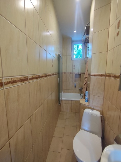 Łazienka z wc - glazura i terakota, wanna z prysznicem.