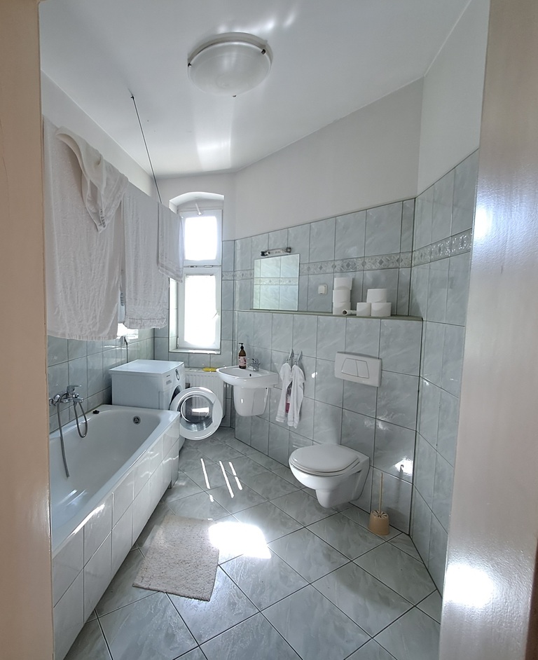- i łazienki z oknem, wanną , pralką i toaletą 6,34 m2,