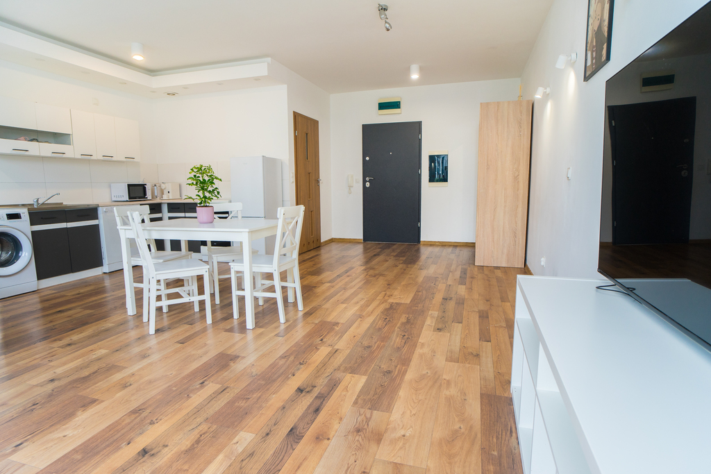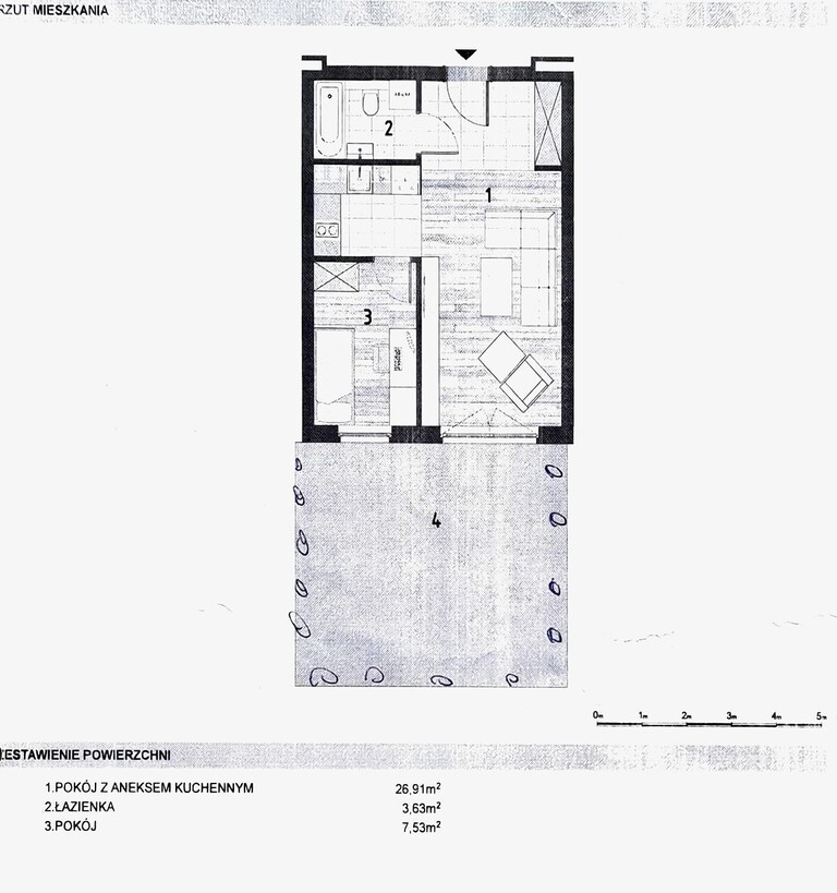 Na powierzchnię mieszkania składają się salon z aneksem kuchennym (typu: "open space") oraz wyjściem na taras, łazienka z WC.