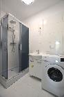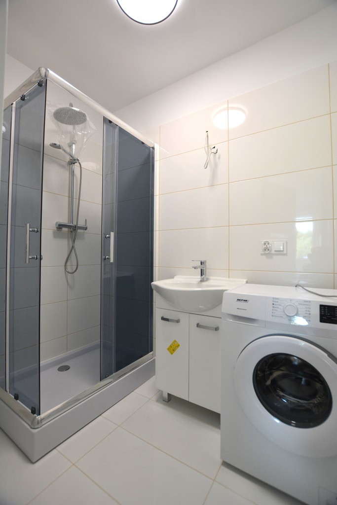 Łazienka w glazurze z kabiną natryskową oraz pralką.