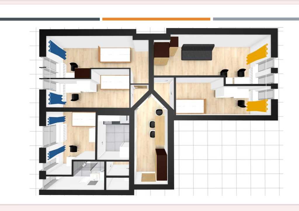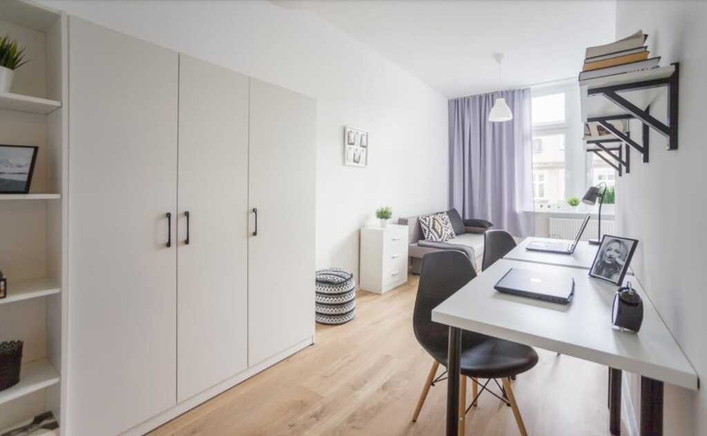 81 m? składa się z:- pięciu pokoi (cztery jednoosobowe oraz jeden dwuosobowy),- kuchni,- łazienki z kabiną prysznicową i toaletą- osobnego wc- przedpokojuDodatkowo do mieszkania przynależą